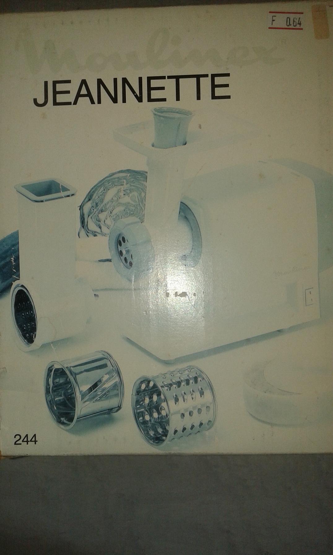 | 0639 | Moulinex Jeanette 244: Küchenmaschine mit Fleischwolf-Vorsatz, Vorsatz zum Raspeln, Reiben, Hobeln ausserdem mit Zubehör für Plätzchen, Spritzgebäck.... Alles kein Problem Original verpackte Moulinex Küchenmaschine. |